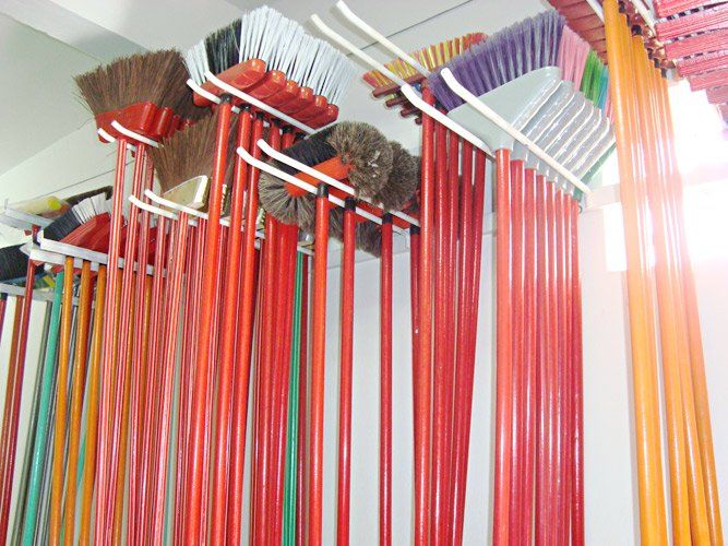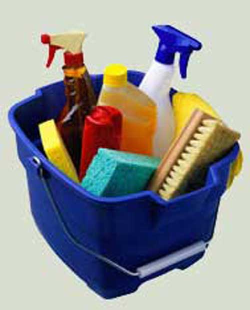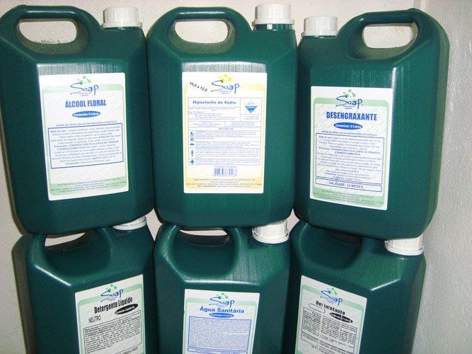 de todos os tamanhos e cores, limpadores, cloro, desinfetantes, sabão, sacaria de algodão, rodos, vassouras, baldes, lixeiras, papel higiênico